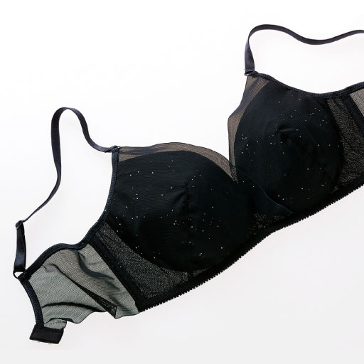 ブラジャーはシアーなチュールネットをカシュクール風に重ねて大人の華やかさを演出。ノンワイヤーで着け心地は軽やか。厚着の季節にこそ着けたくなるインナーです。