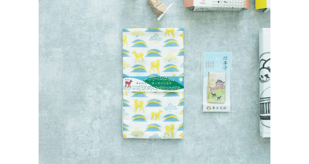 春日大社のそばにある若草山と鹿が描かれたガーゼハンカチ。奈良公園にいる鹿1300頭は、すべてが公園にいるのではなく、この若草山の森のなかに生息している鹿も多いのだとか。