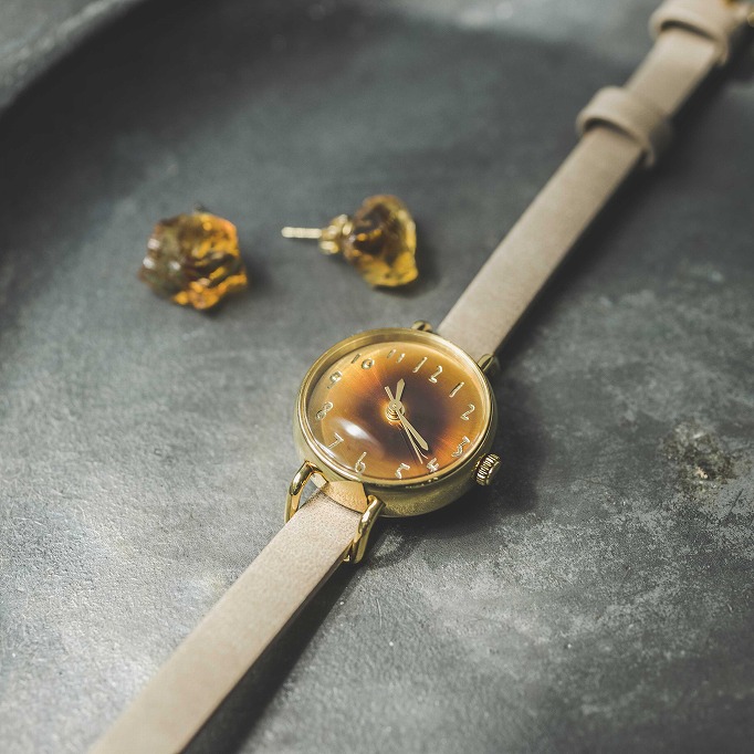 今回ピックアップするのは、琥珀色の腕時計。金沢にある時計工房のアートディレクターであり、日本画家でもある牛島孝さんと一緒に作っている大人気シリーズの最新作です。