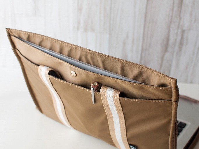 内ポケットのないシンプルタイプだから、ノートパソコンを入れてたためばスッキリと薄くなります。持ち手をポケットに納めた状態でも、一番厚い場所で6cm程度。大きなバッグにインナーケースとして入れるときにもかさばりません。