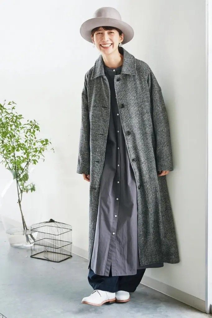 凹凸のある生地感が味わいのあるステンカラーコートは、丸みのあるオーバーシルエットがポイント。ハンサムになりがちなグレンチェックも、やわらかな女性らしい印象に導いてくれます。ボトムスに同素材のスカートを合わせてセットアップで決めれば、きちんと感もありつつ気負わないスタイリングに仕上がります。小物は引き締め色の黒でまとめましょう。