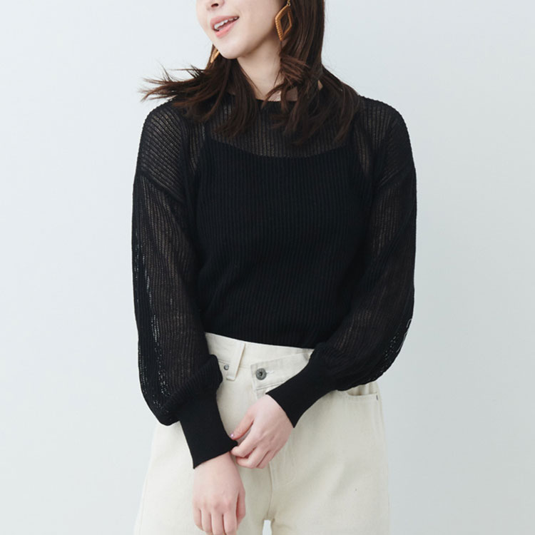 繊細なレース調の編み柄が入ったシアー素材のニットと、肌当たりがいいとろみ素材のキャミソールのセット。ニットはさり気ない透け感があり、ふわっとしたボリュームスリーブで女性らしさがありながら、クルーネックとドロップショルダーのゆるいシルエットで甘さを控えめに。どれも大人に似合うカラーで、インのキャミソールは重ねたときにきれいに見える色をセレクト。シックな印象に仕上げています。