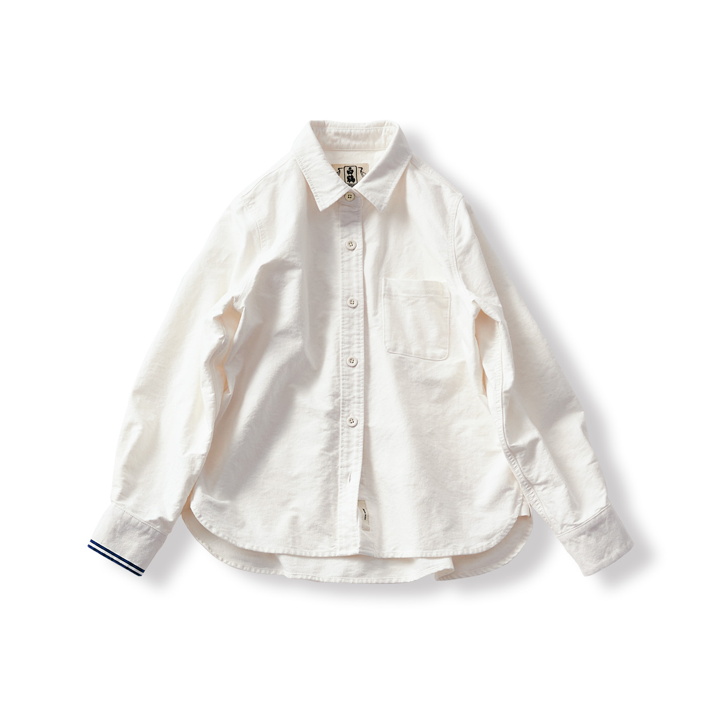 フェリシモがある神戸と私の地元である西宮には、灘五郷と呼ばれる有名な酒どころがあります。せっかくだから酒蔵さんといっしょに作りたい!との想いから、今回縁あって白鶴酒造さんとのコラボが実現しました。白鶴さんからお話を聞いて、服づくりにぴったりと思ったのが「麹の布団」。 麹づくりで温度管理の微調整に麹蓋の上から布団のようにかける布です。この布でシャツを作りたい!と、生地屋のシャトルノーツさんでほぼ同じものを再現してもらいました。しっかり打ち込まれた厚手の生地の裏には密度の高い起毛がほどこされ、見るからにぬくぬくの暖かい「麹の布団」を、着やすいシャツに仕立てることができました。右袖口に、蛇の目模様の入ったお猪口をイメージして入れたブルーの2本線を、デザインとして効かせています。