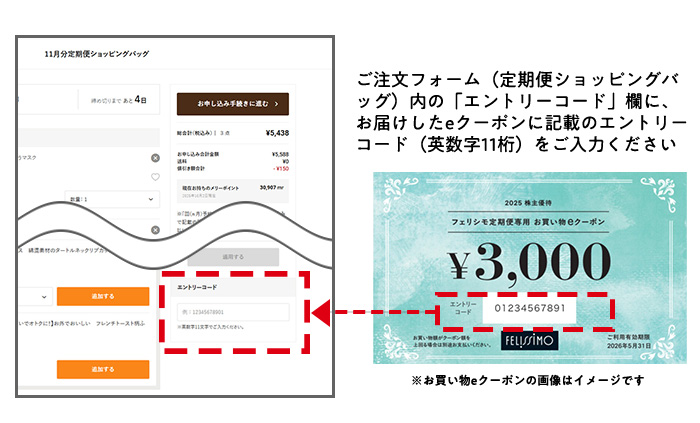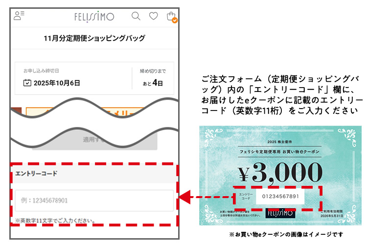 ご注文フォーム(ショッピングバッグ)内の「エントリーコード」欄に、eクーポンに記載のエントリーコード(英数字11桁)を入力してください。