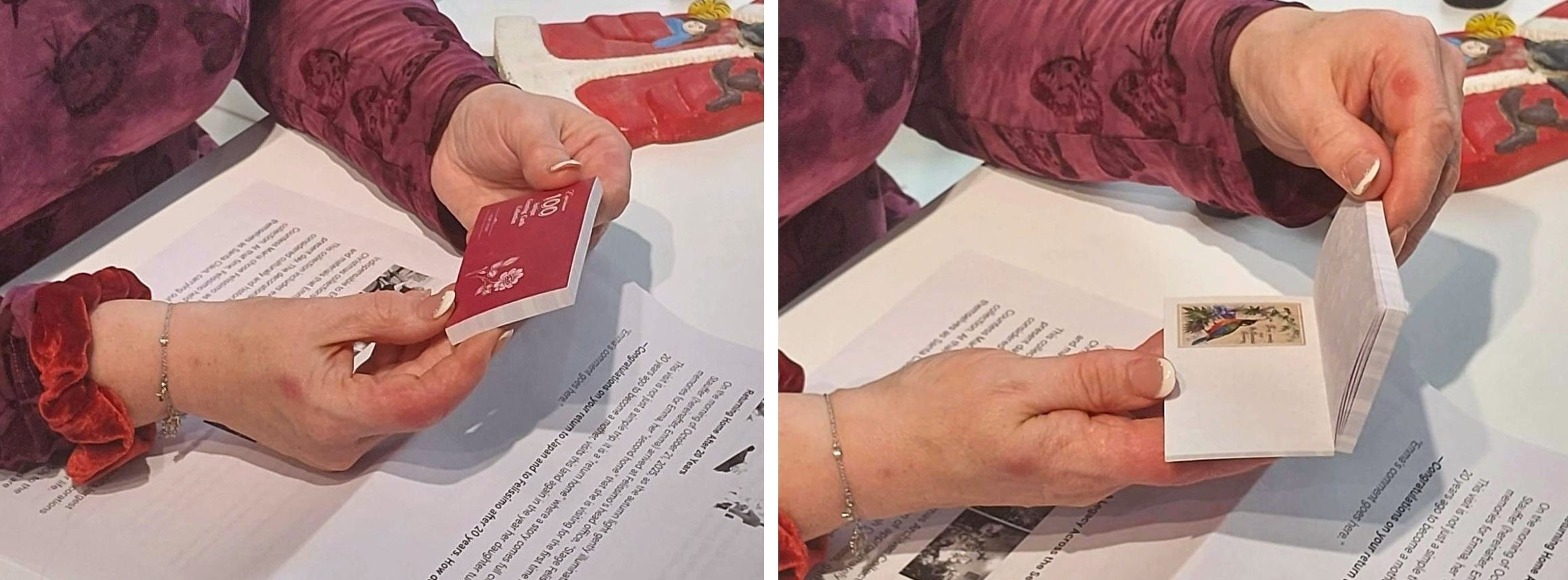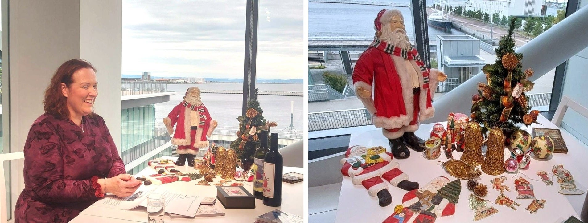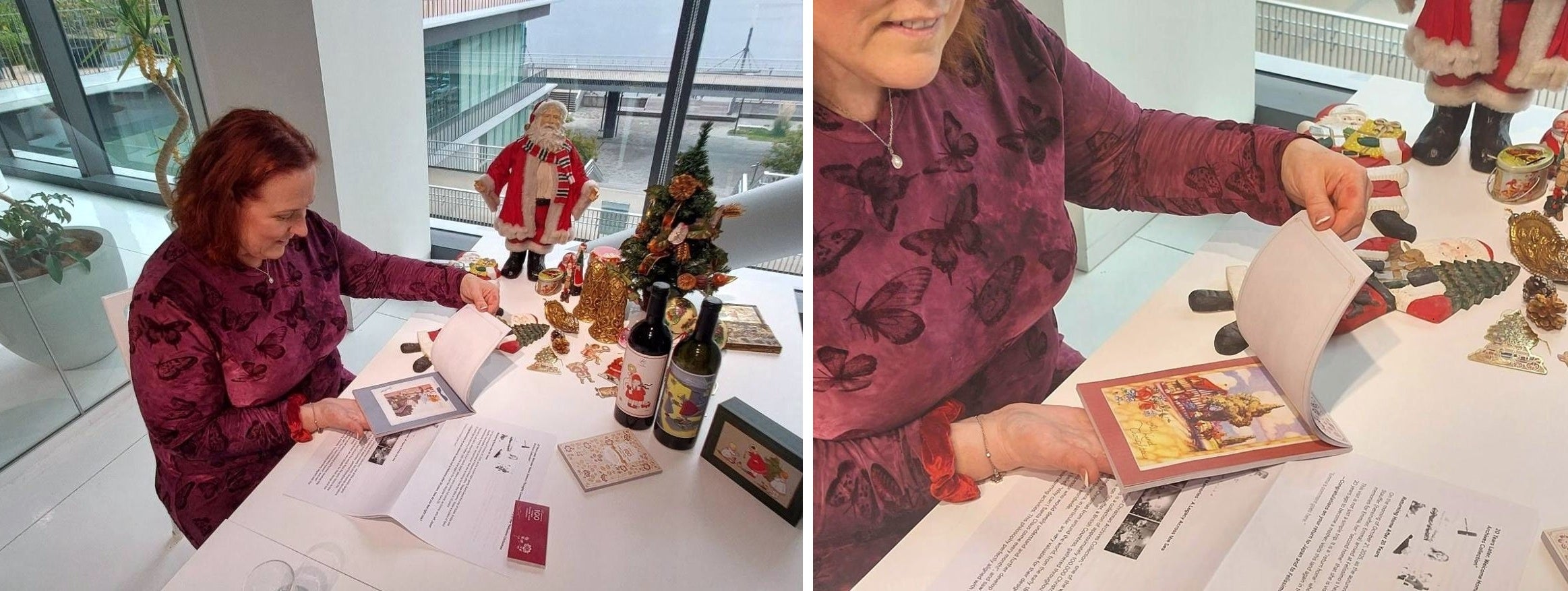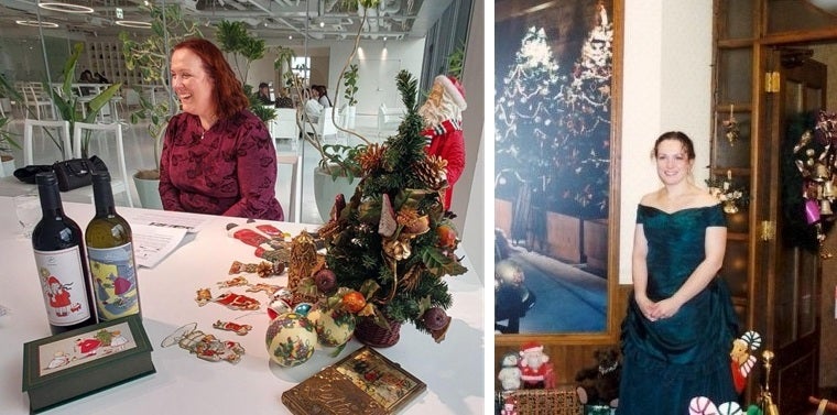 フェリシモが所蔵する「フェリシモ クリスマス アーカイブス コレクション」の一部に再会して微笑むエマさん