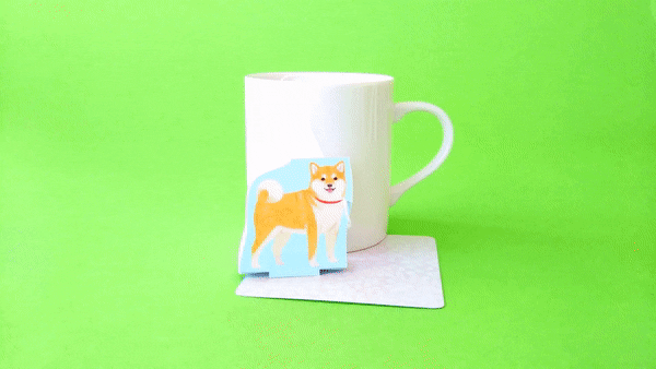 柴犬とお散歩したい!そんなささやかな夢、かなえます! 柴犬型のタグにティーバッグをつけて地面柄のコースターを配置したら、テーブル上でお散歩スタート。柴犬色のほうじ茶で、気分もほっこり。