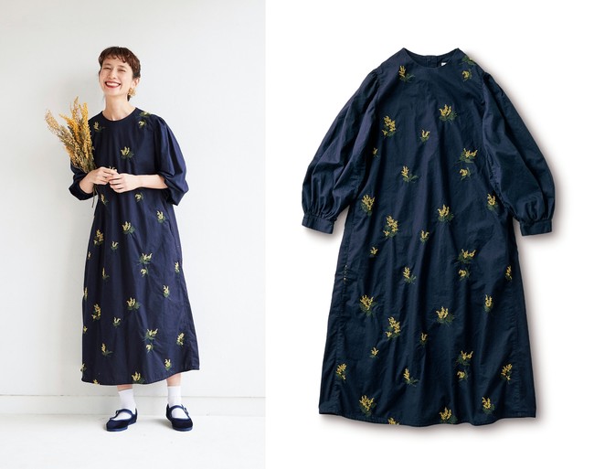kazumiさんのリクエストによりオリジナルのミモザ刺しゅうをほどこした生地を使ったワンピース。袖と身ごろの生地を変え、袖はふんわりと仕上げているところもポイントです。ワンピニストkazumiさんならではのアイデアが詰まった、春にぴったりの一枚です。やわらかな生地を使い袖山にもギャザーが入ったパフスリーブにして、袖口は半分ゴム仕様でたくし上げやすいようにしています。たくし上げて着ると、袖のボリュームが強調されグッと女性らしい印象になります。大人な雰囲気の刺しゅうワンピースにと、後ろは無地の生地にタックを入れて上品に仕上げています。