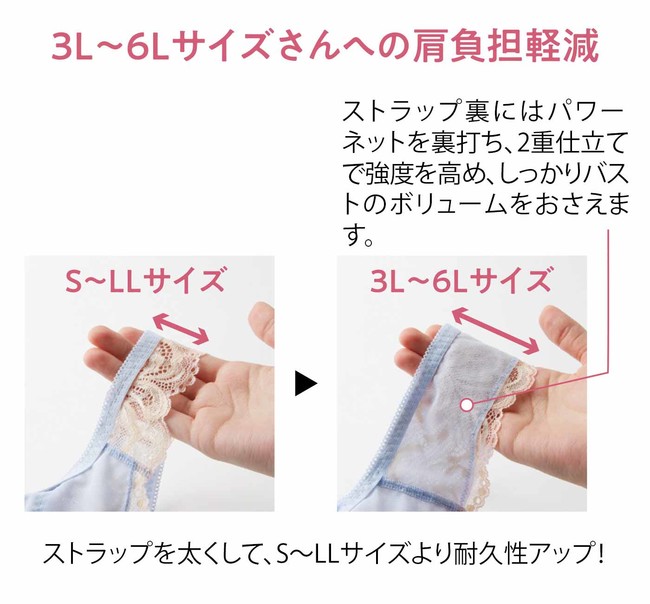 3L~6Lは、よりボリュームのある胸を支えるため肩への負担を軽減できるように仕様を変えています。