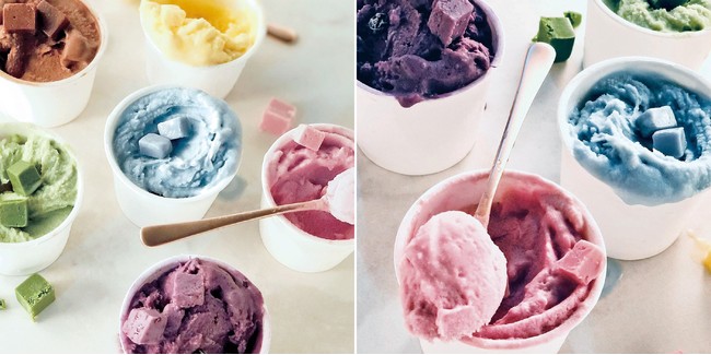 カラフルなチョコが人気の昨今、「幸福(しあわせ)のチョコレート」のカラフルチョコといえばカナダ・バンクーバーの「ココナマ」。バンクーバーに移り住んだ日本人カップル、タカさんとカヨコさんが2010年に開いた、カナダの魅力をふんだんに詰め込んだ独創的なチョコが魅力のショップです。その「ココナマ」のチョコを、日本の職人が口溶けのよいジェラートに仕上げています。地元バンクーバーの素材にこだわった2個のキューブチョコ入りジェラートは、チョコのおいしさがダイレクトに伝わります。トッピングのまま食べたり、砕いて混ぜたり、自分で仕上げるのもお楽しみです。