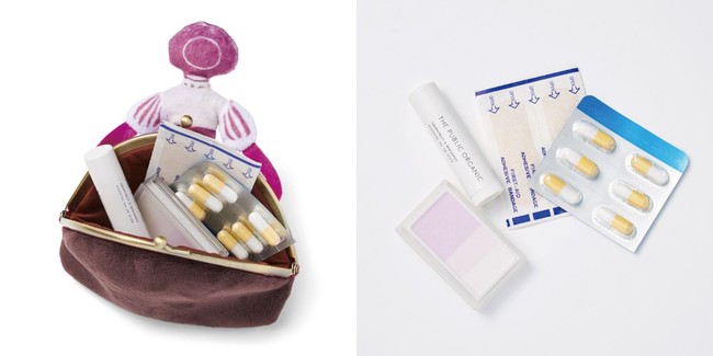 後ろに大きく開くがま口は、かばんの中で散らばりがちなコスメアイテムや薬・ばんそうこうなどを持ち歩くのに便利です。
