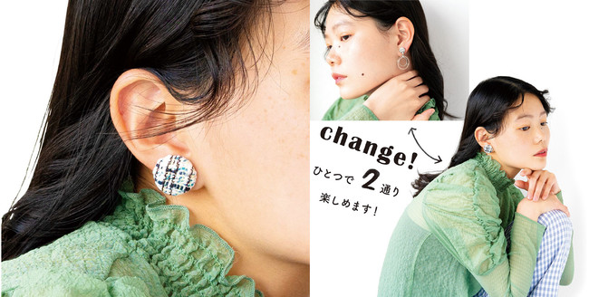 イヤリング金具にマグネットが付いているので、トップパーツだけをサッと付け替えられる技ありイヤリングです。ツイードの素材感がアクセントのくるみボタンと、キラッと揺れるトップの2種類が毎月デザインを変えて届きます。集めれば、組み合わせを変えて付け替える楽しみが広がります。