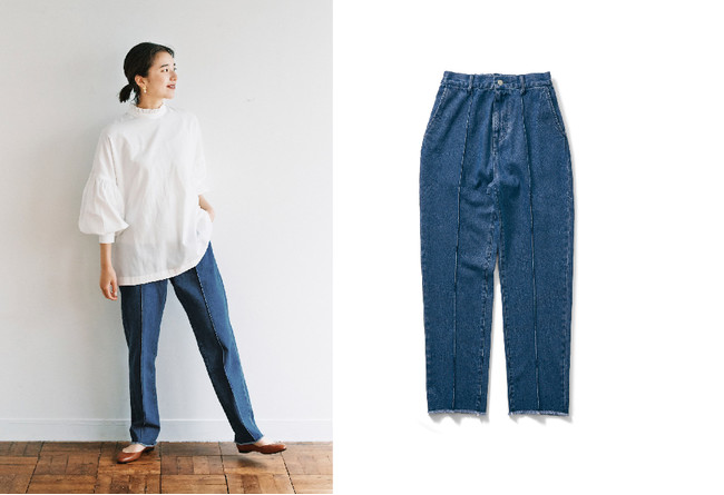 秋のデニムパンツは、オーバーサイズのトップスとの相性も考えて、脚のラインをひろいにくいゆるめシルエットに。カットオフしたすそでニュアンスアップさせています。前後に配したラインをつまんで縫い上げ、アイロンで付けたセンターラインのようなデザインをキープできるようにしています。どんなトップスも柔軟に受け止める頼もしさと、背面ゴムのノンストレスのはき心地は、ずっと変わらないアヴェクモワの服へのこだわりです。