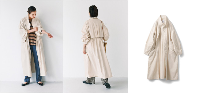 はおるだけでコーデが見違える、オフベージュのロングコートです。ウエストをギャザリングするドローストリングや高めにした衿、背面にあしらったアンブレラヨークなど、おしゃれの格を上げる仕掛けが随所にあふれています。特にこだわっているのがスリーブで、袖をたくし上げて抜け感を作ることができるように、アームホールをかなり広めに設定し、袖口はゴムと面ファスナーでしっかりホールドできるデザインとなっています。ふだん着がこなれて見える一枚です。