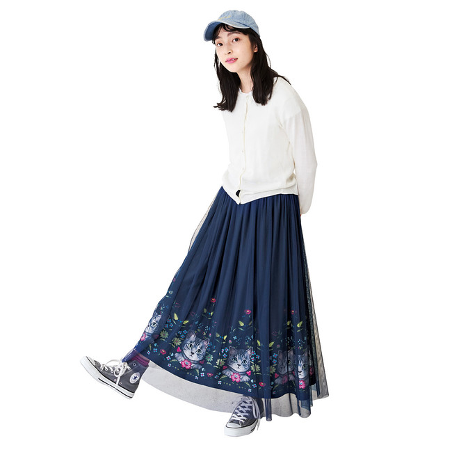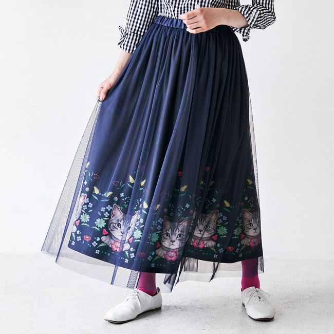 株式会社フェリシモが展開する「フェリシモ猫部(TM)」は、「サバトラ猫とお花のチュールスカート」のウェブ販売を8月18日より開始しています。猫部でおなじみのイラストレーター霜田有沙さんが描く猫と、ハンガリーの伝統的なカロチャ刺しゅう風のお花をプリントした人気のスカートに新デザインの登場です。動くたびにチュールの影にチラッと見えるサバトラ猫と花の、さりげない華やかさが魅力の一枚は、ダークネイビーのベースにチュールを重ねて、大人がはきやすいシックな雰囲気のスカートに仕上げています。スニーカーやバレエシューズ、パンプスなど、足もとを選ばないので、シーンに合わせて雰囲気を変えられるのもポイントです。ちょっと大人なチュールスカートで、猫好きさんの秋冬コーデをお楽しみください。販売価格の一部は飼い主のいない動物の保護と里親探し活動、野良猫の過剰繁殖防止活動、災害時の動物保護活動などに活用されます。