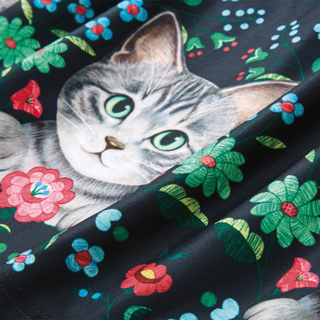 ハチワレ猫さんと、ハンガリーの伝統的な刺しゅう風のお花をプリントしたスカートです。