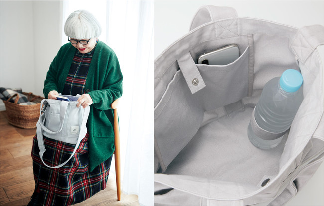 手さげにもなって肩がけもできることや、肩ひもは調節可能であること、まちがしっかりとあってモノを入れやすいことや、ペットボトルが倒れないようにループを付けるなど、bonponさんおふたりのアイデアが詰まりまくりのバッグに仕上がっています。色はどんな服にも合わせやすく、汚れが目立ちにくいグレーにしました。ぜひ秋の行楽にいっしょに連れていってください。