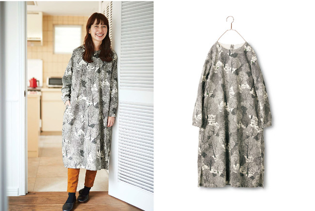 綿のツイル生地を使い、ストンとしたすっきりシルエットで仕立てた「リカさんの愉快なキャンプワンピース」。シンプルデザインですが、両わきにスリットを入れてポイントにしています。ゆったりとした身ごろいっぱいに広がる森のキャンプ場プリントで、ほんのりと北欧テイストに仕上がりました。「こどものころに友達や家族と行った休日のキャンプ。外でみんなと食べるご飯はなぜだかいつもより数倍美味しいですよね。楽しかった想い出のひとつです。その時にいろんな色のテントが並んでいて、『かわいいなぁ』と見ていたのを思い出し、そんな想い出の場面を切り取って柄にしました。
