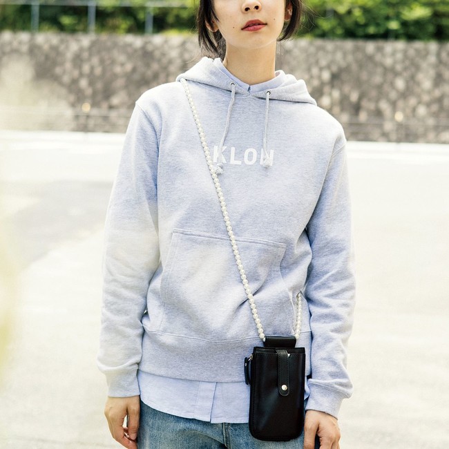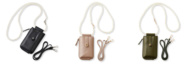 一見パールネックレスのようで、実はスマホをサッと取り出せて、お財布機能も備えたボディーウォレット。これひとつで身軽に出かけられます。シンプルな気分の時はエコレザーのストラップに付け替えれば、印象を変えて楽しめます。