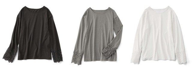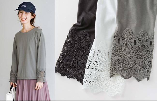 ニットカーデやスウェットの下に合わせるだけで、華やかな春気分になるトップスです。袖口に大人っぽいレースをあしらった長袖トップスは、下着が見えにくいクルーネックで、一枚で着てもすっきりきれいに見えます。ロングシーズン愛用できます。