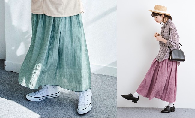 軽やかな楊柳素材の風合いとニュアンスパステルのカラーがきれいなロングスカートです。ウエストはストレッチ生地がやさしくフィットし、折り返すことで丈調節も自在、吸水速乾の裏地も付いて、これからの汗ばむ季節にも快適です。