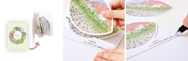 どれを使うか本のようにめくりながら選べます。ミシン目で切り取って使います。本の本体には送った相手の名前と日付を記録しておけるメモスペース付きです。切手を貼ってそのままはがきとして送っても、封筒に入れて封書として送っても◎。