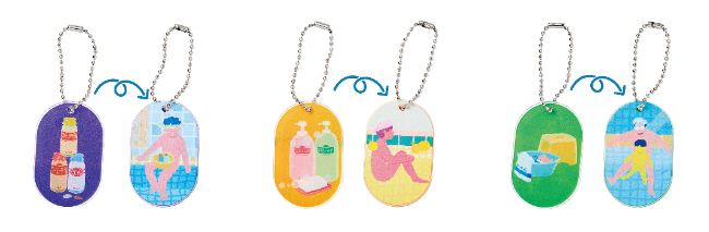 デザインは3種類。それぞれロッカーキーの番号札をイメージした形状に、牛乳びんやシャンプーボトルなど銭湯モチーフをプリントしたキーホルダーが付いています。