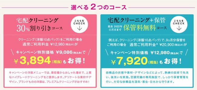 ・依頼品の状態やデザインによって先洗い、もしくは後洗いを行い、空調完備の専用保管施設で、最長2022年11月30日(水)まで保管管理し、2022年9月1日(木)~11月30日(水)の期間内の希望日時に自宅へ届きます。通常利用料金に比べ¥7,200(+10% ¥7,920)円お得です。