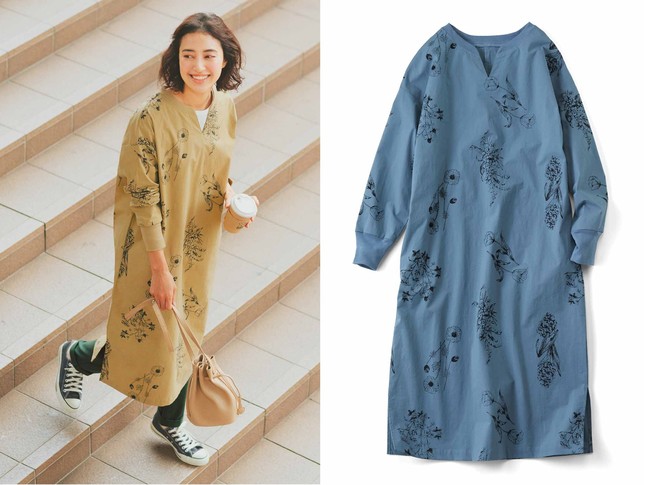 着心地のいい伸びやかなストレッチ素材と、大人っぽいボタニカル柄のワンピースです。スズラン、チューリップ、ヒヤシンス、ポピー、アカツメクサなど、春夏らしい花たちが描かれています。からだのラインを拾わないすとんとしたシルエットに、すっきりしたキーネックが特徴です。サイドスリット入りでパンツとも重ねやすくなっています。
