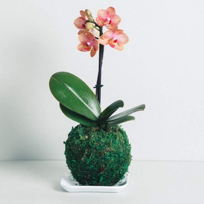 小さくとも、優雅で存在感のある胡蝶蘭が苔玉の器に入っています。敷居が高いイメージの胡蝶蘭も、小さくまん丸の苔玉に入るとグッと愛着が湧くようになります。花の色は定番の白やピンクではなく、置き場所を選ばず、自然にお部屋に溶け込むようなオレンジです。