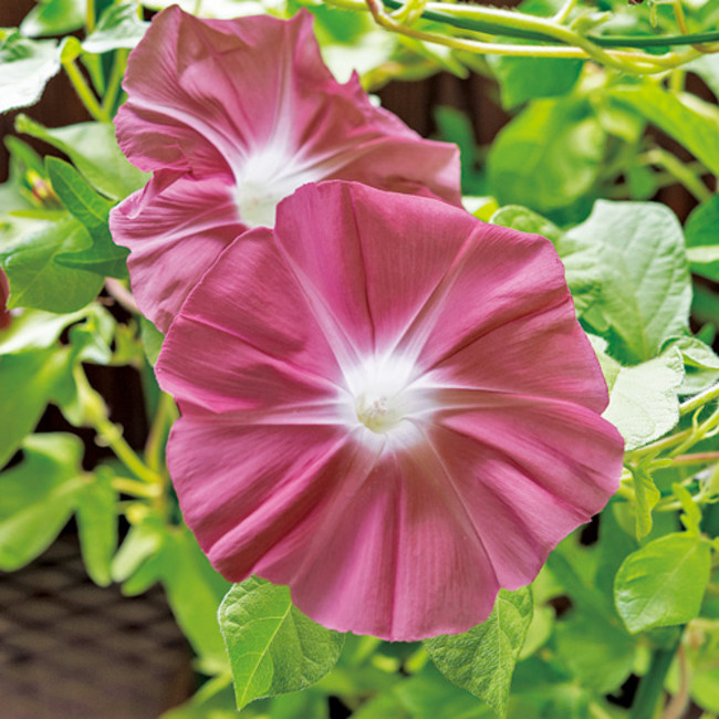 あさがおは〈日本あさがお〉と〈西洋あさがお〉の2種類にわけられます。「団十郎あさがお」は、えび茶色の花と黄緑色のせみ葉が大輪に咲き誇る日本あさがおで、種の確保が難しいことから、幻の品種といわれています。今回は苗(ポット)で届くため、お好みの鉢で楽しむことができます。