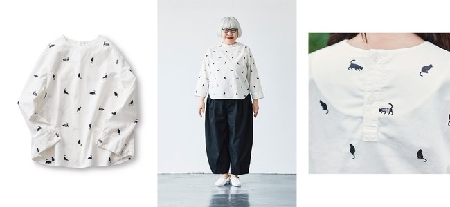 bonpon夫婦が、Sunny cloudsの服を愛用していたことがきっかけで始まったコラボレーションです。今回は猫好きなおふたりにぴったりな、猫モチーフのトップスを販売しています。「大人が着られる、かわいくなりすぎない猫柄」を目指し、猫シルエットの総柄ブラウス「ponさんの猫トップス」、ポケットに猫のワンポイント刺しゅうをほどこした「bonさんの猫シャツ」の2アイテムです。どちらもモノトーンで着やすく、さりげないリンクコーデも楽しめるアイテムです。