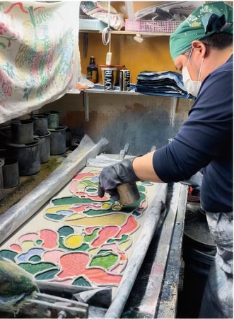 折り重なった生地の上から染料を注ぎ、下に 吸引させることで表裏がない美しい染め上がりをかなえる伝統技法です。職人の手と感覚から生まれるやさしい「にじみ」 や「ぼかし」の何ともいえない味わいを感じることができます。