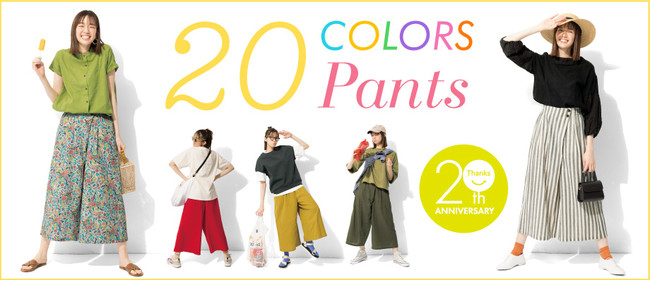 20周年記念パンツは花のように色とりどりな20色が用意されています。スカート見えする、シンプルなデザインのワイドパンツで、トップスを選ばずに着られます。様々な色をそろえて、コーディネートによって使い分ける事ができます。