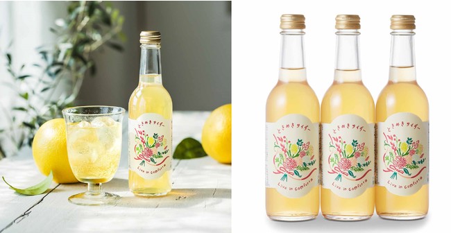 暑い夏に頑張るみなさまへ「乾杯」のごほうびのさわやかなサイダー、グレープフルーツ果汁19%で白ブドウ風味の甘さ控えめで、すっきりとした大人の味わいです。ボトルラベルは「にじゆら」がデザインした感謝の花束です。