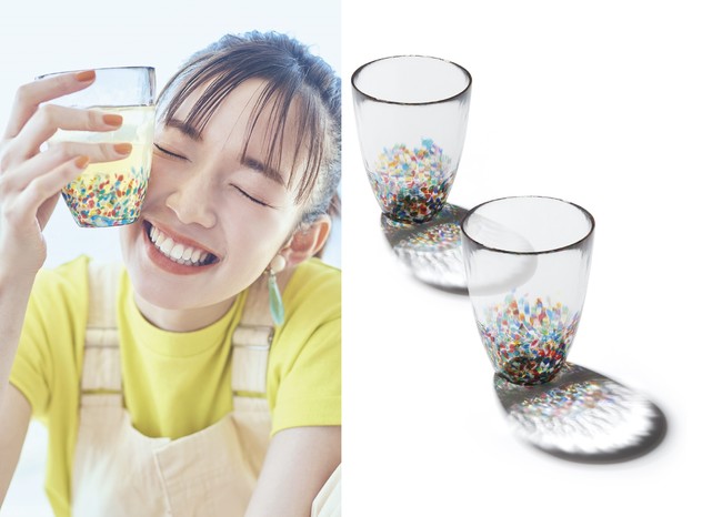 サイダーの色とマッチするタンブラーも販売中です。表面に凹凸を作り出す色ガラスにより、光が当たると、彩り豊かな影がゆらりとテーブルに映ります。津軽びいどろの職人によるハンドメイドで、光の当たり方で表情が変わります。