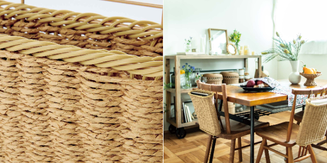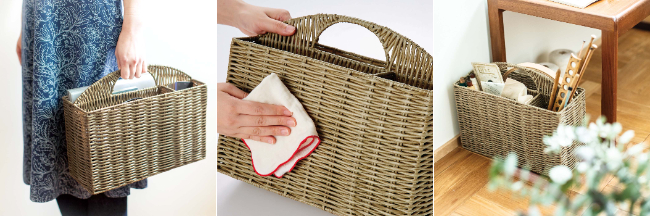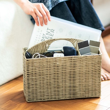 家中の好きな場所で趣味や仕事ができる、持ち運びバスケットです。在宅ワークに使うノートPCや資料などを入れて、そのまま部屋をさっと移動できます。天然素材風の仕上がりなので、インテリアになじみやすい風合いです。