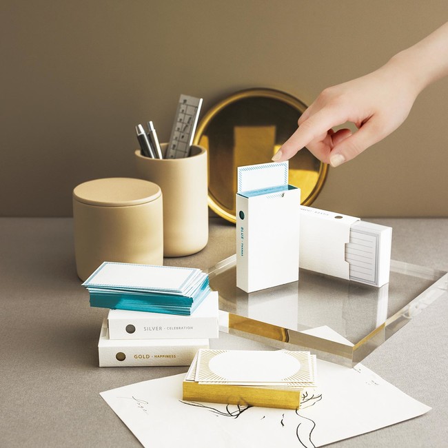 「日常にメッセージを添える」をコンセプトに作られた、名刺サイズのメッセージカードです。断面の天金加工と、表面にあしらった箔押しの縁飾りや罫線がメッセージを端正に引き立てます。たっぷり70枚セットで、3種類のデザインとカラーがあり、シーンに合わせて使い分けることができます。