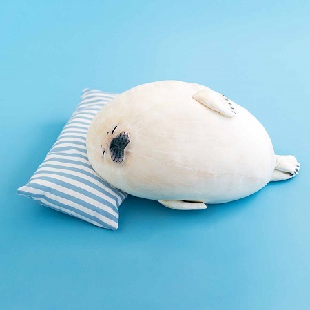 信じられないほど無防備な姿で眠るゴマフアザラシの赤ちゃんの実寸大クッションです。