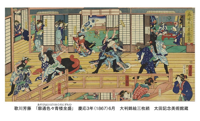 〈廓通色々青楼全盛(あそびはとりどりかごのにぎわひ)〉