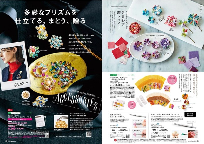 20周年記念の糸セットや、キラキラと輝くビーズや、色とりどりのカットクロスなど、色とりどりの素材は、見ても、作っても思わず夢中になります。更に完成したアイテムをアクセサリーとして身につけたり、デスクのお気に入りの場所に飾ったり、つくる時間も、そのあとも、愛しい時間が続きます。