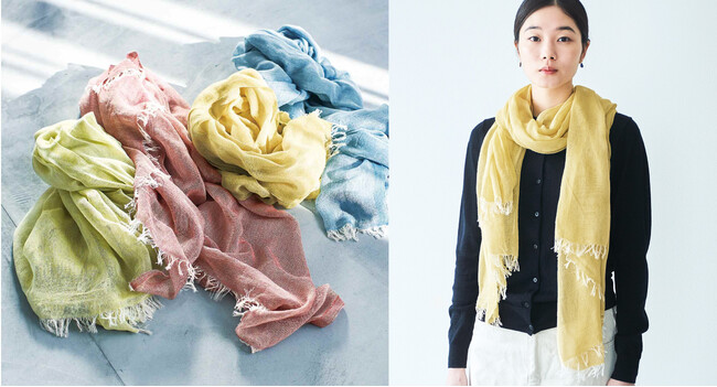 空気のように軽くやわらかく肌になじむ「かや織り」の綿100%のストールです。古くから蚊帳にも使われてきた「かや織り」は目の粗い平織りゆえの通気性のよさが特徴です。ふわりとやさしい白糸と色糸が織りなす繊細な美しさが、装いの春を心地よく彩ります。