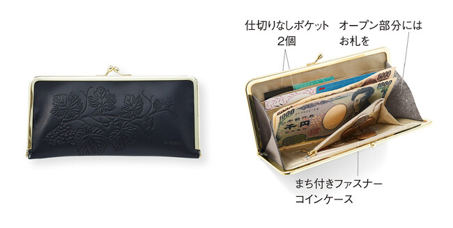 約1.5cmの薄さに充分な収納力を持たせた、姫路レザーのがま口財布です。表面と裏面にはヨーロッパの古い建築レリーフ図案をベースにした、ぶどうモチーフの型押しがあしらわれています。仕切りのないカードケースと、浅めのコインケースだけのミニマムな設計で、使い方の自由度が高いのも魅力です。