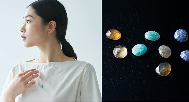 ローズカットと呼ばれる多面カットが、春の光をはじいて輝く、天然石のアクセサリーです。チェーンリング、イヤアクセサリー、ネックレスを全4種類で展開。古くから宝石の街として栄えるインド・ジャイプールの職人の手でていねいにカットされた天然石を、ひと粒ごとの形に沿わせて枠巻き留めされています。