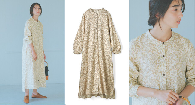風合い豊かなスラブ感のあるコットン生地にモリスの〈シスル〉柄をプリントしたワンピースです。シスルはアザミのこと。ベージュの濃淡の2色遣いは、インパクトのある柄に上品な印象を与えます。きれいなAラインのシルエットでワンピースとしても、羽織りとしても活躍します。