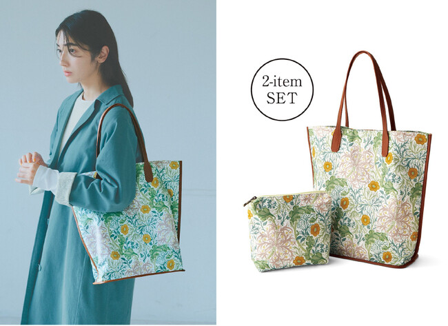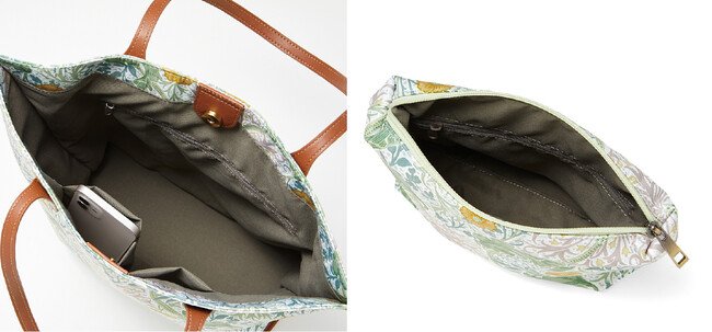 繊細優美な〈モリス シーウィード〉の柄を淡めのトーンでまとめたトートバッグとポーチです。バッグは、軽量でA4サイズの書類がすっぽり入る容量で、通勤から小旅行まで活躍します。ポーチは大きめなので、バッグインバッグ感覚で使うほか、旅行の荷物整理にも便利です。
