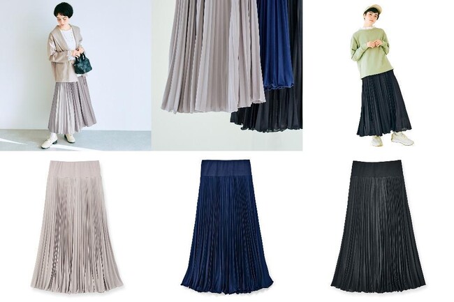 印象的に揺れる軽やかなプリーツが魅力のスカートです。プリーツによってすらりと縦長の印象になるため、細見え効果もあります。きれいめにもカジュアルにも着られて、ジャケットをはおればオケージョンにも活躍します。幅広のウエストを折り返して丈感の調節もできます。