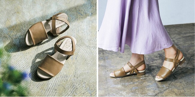靴作りの町・神戸市長田で作られた、靴職人が一足一足手がけるサンダルです。色は上品なウッドベージュで、ストレッチフェイクレザーの伸びやかさと縫い目ができるだけ目立たないように仕立てています。靴工場が長年にわたって培った知識から生まれるこのサンダルは、春夏の足元を美しく彩ります。