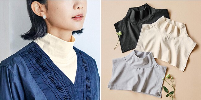 タートルネックを重ね着しているように見えつつ、首もとを日差しからも冷えからも守れる付けハイネックです。コットンリネン素材なので、むれにくく、さらりとした肌触りが特徴で、就寝時にもおすすめです。ベーシックなカラーなので、コーディネートもしやすいです。