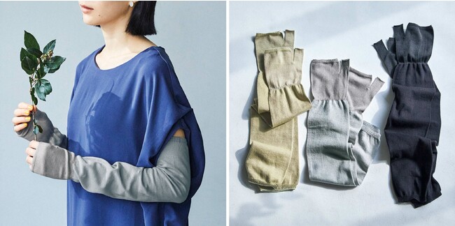 縫い目のないホールガーメント(R)で編み立てたアームカバーです。腕部分はコットン100%で編み立てられ、汗でむれやすい手や指の部分は、シルク混素材で滑らかな肌触りに仕上がっています。薄手の素材でできているため、軽やかな着け心地が味わえます。二の腕から手の甲、親指までカバーしつつ、指先は自由に使えるため、スマートフォンの操作や鍵の開け閉めもスムーズに行えます。