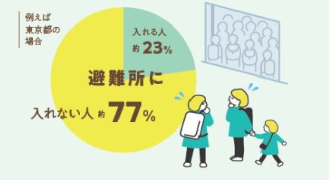 例えば、東京都の避難所の収容人数は約320万人(2020年4月時点)※1ですが、東京都の人口は約1,400万人(2023年1月現在)※2。これは、4~5人に1人しか避難所に入れないことを意味します。家が危険な状態でない限り、在宅で過ごすことを考慮する必要があります。「みんなのBOSAIプロジェクトもしもしも」はこの事実を課題と捉え、対策を考えました。